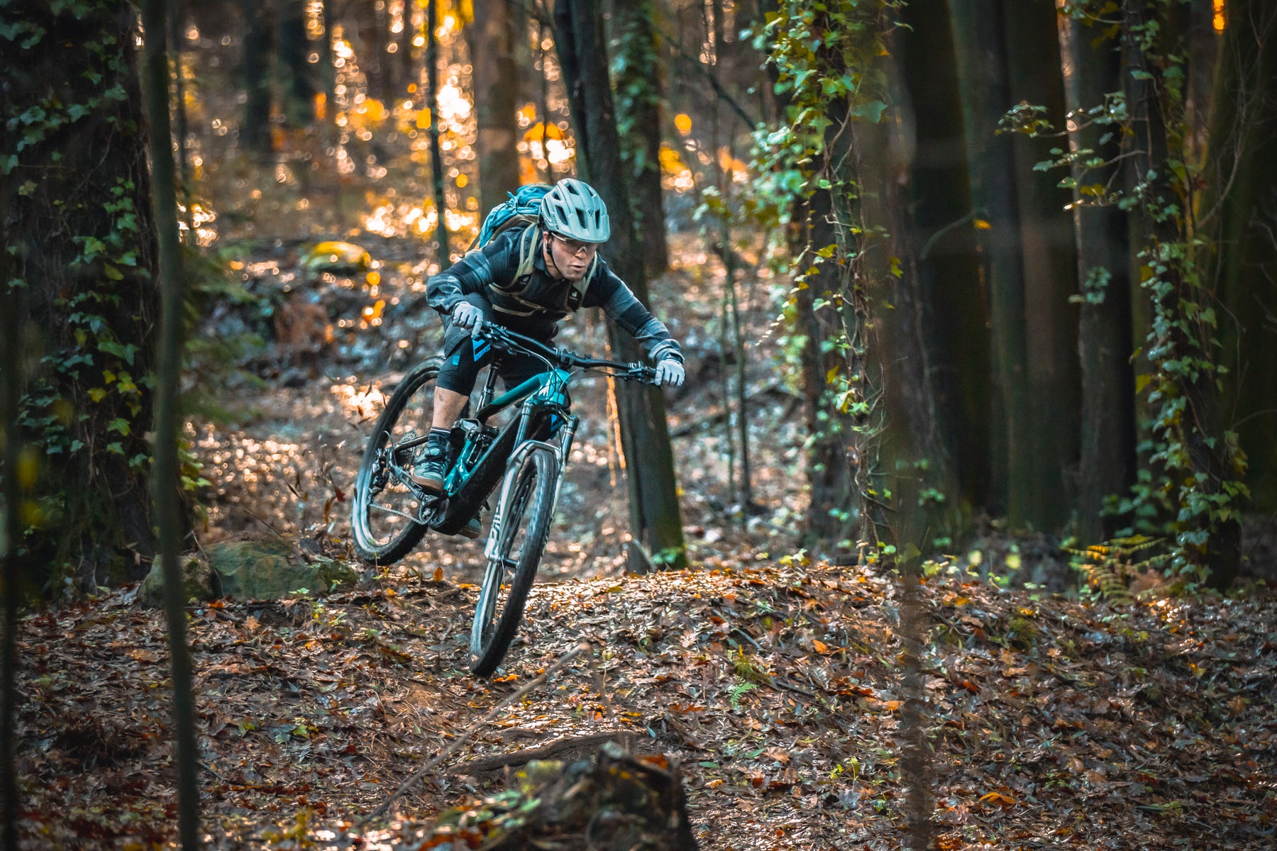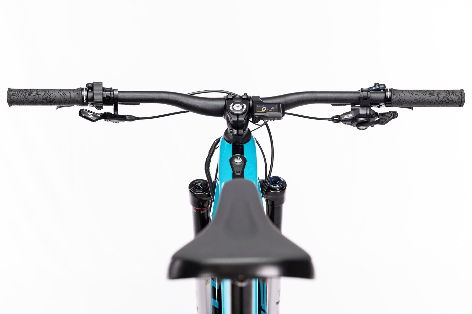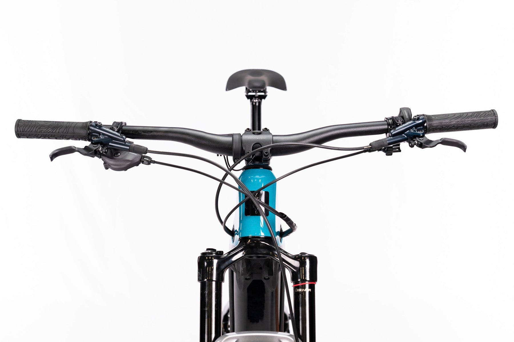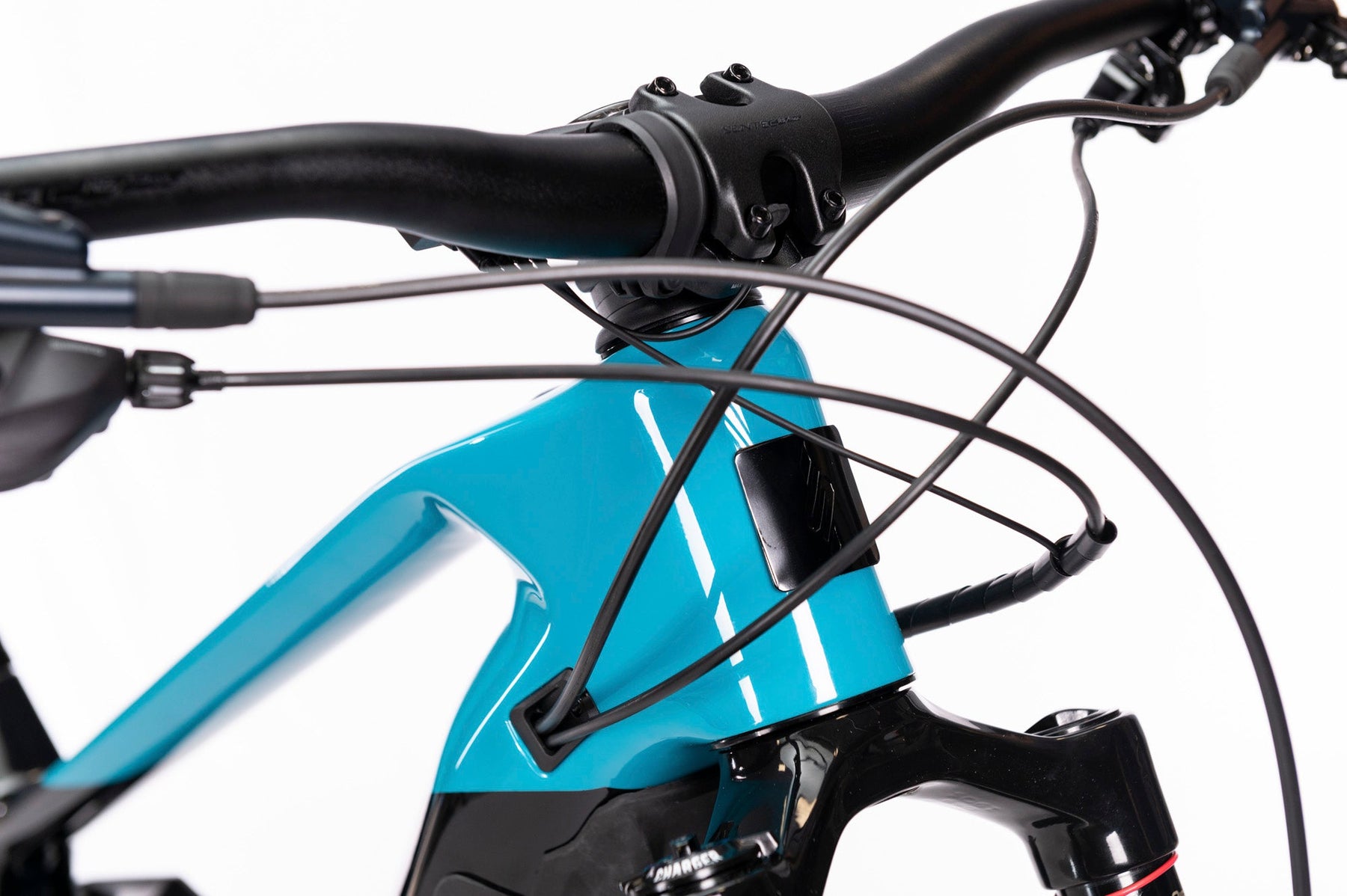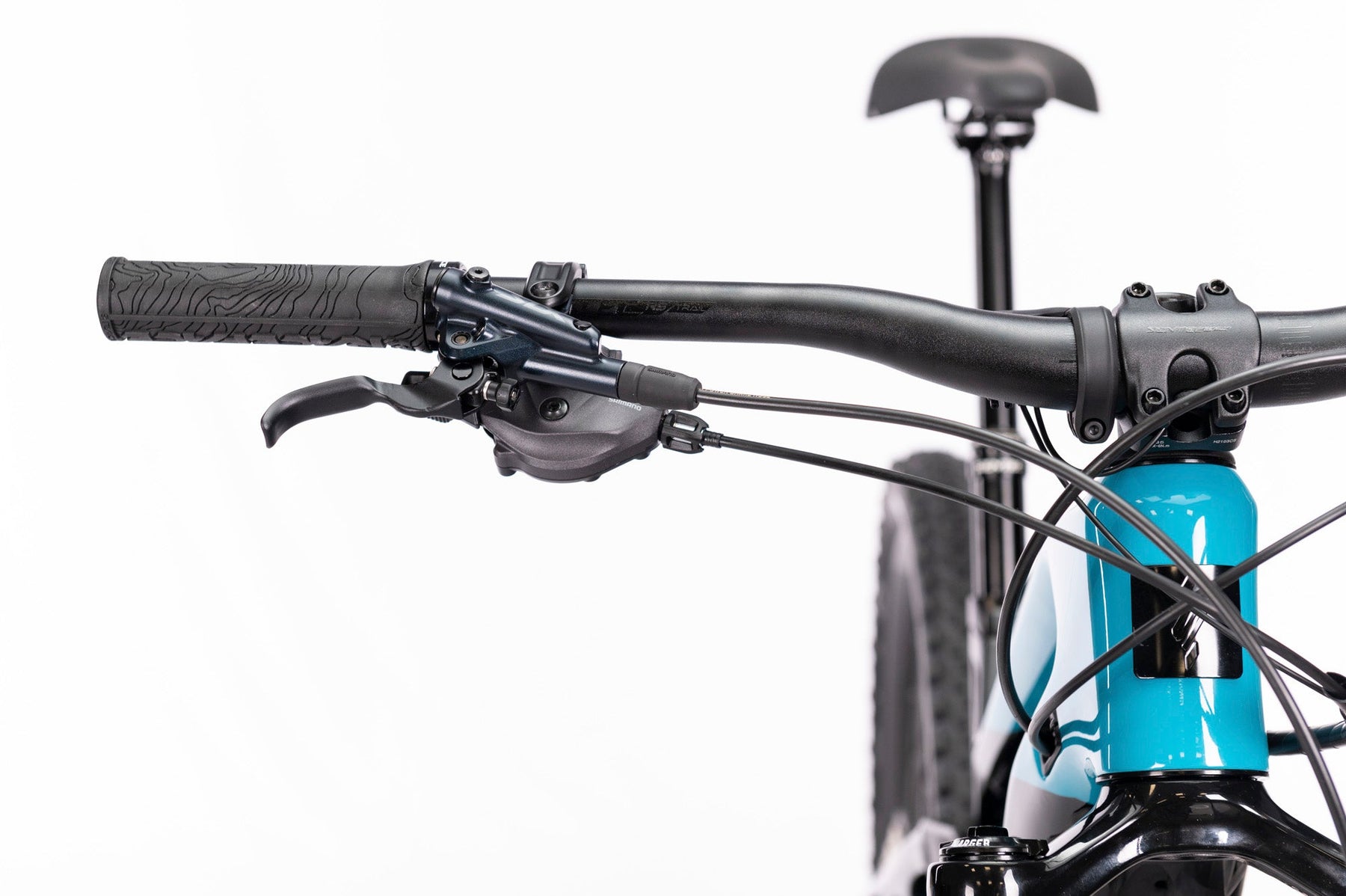 The 29" wheel configuration favors increased wheel fluidity to maintain speed and control on rough trails.