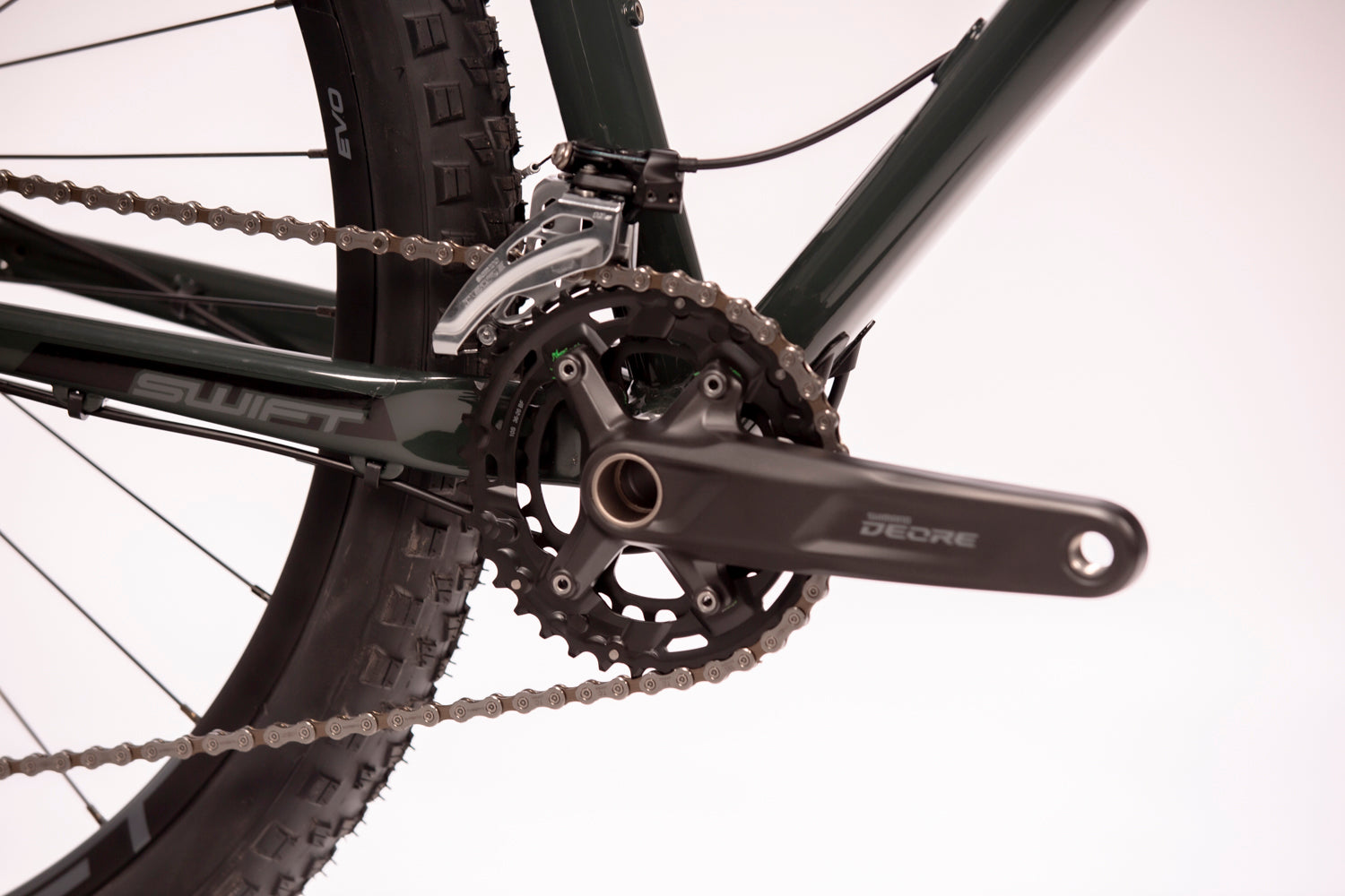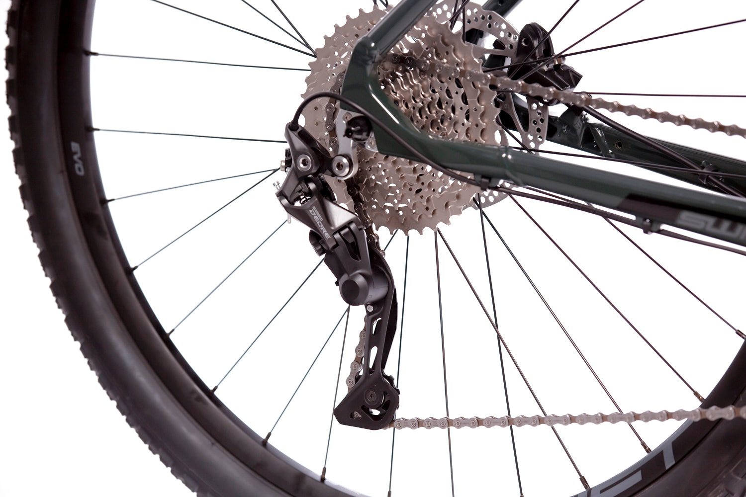 This bike is also equipped with a Shimano Deore 2x10 speed transmission with a 11-42 cassette, offering vast gear options and allowing you to pursue long and steep climbs.